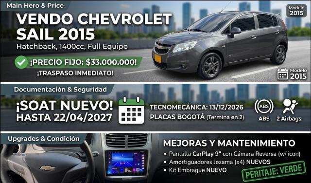 $ 33,000,000 CHEVROLET SAIL LTZ SPORT 2015 Bogotá
